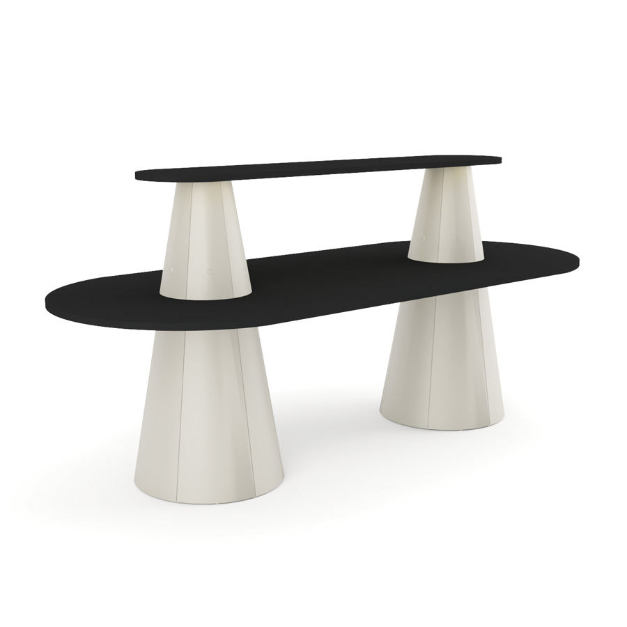 Conische onderstellen voor krukken en vergadertafels. Tafelonderstellen voor zit-en poseurtafels. OTT-Cone voegt tafels met oplaadpunt en verlichting toe. Stalen